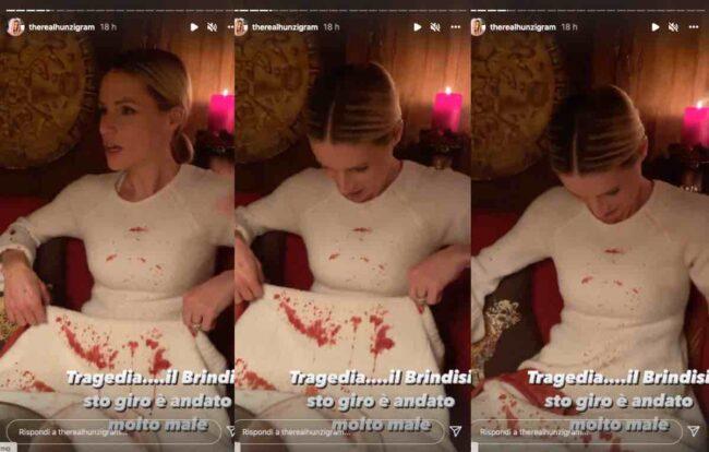 La conduttrice era a cena con suoi amici, tra cui l’attrice e presentatrice Serena Autieri. Una cena molto tranquilla in cui alle portate si accompagnava anche del vino. Ma ad un certo punto si verifica la “tragedia” così l’ha definita la stessa Hunziker. In una storia, infatti, si vede il suo vestito ricoperto da dei schizzi di vino. Ad aggravare la situazione il fatto che il vestito fosse completamente bianco.
