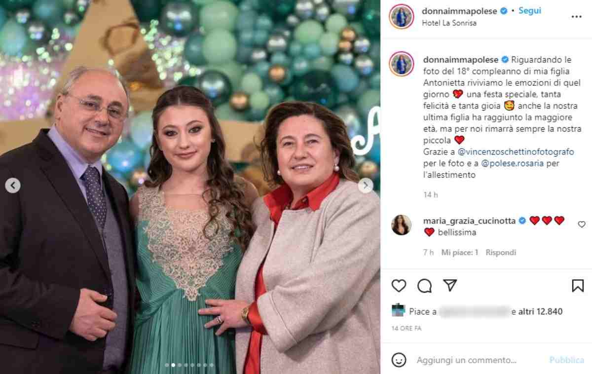 Nella famiglia c’è anche Antonietta Giordano. Poco tempo fa, la ragazza, ha raggiunto la maggiore età. Imma Polese ha voluto ricordare quel giorno con alcuni scatti condivisi su Instagram. La ragazza si mostra chiaramente bellissima e, seppur in foto, si vede tutta la soddisfazione dei genitori. Indubbiamente, il legame che li unisce è forte e diventa ancora più grande tramite il ricordo di suo nonno. Come detto, la figura di Don Antonio Polese è stata fondamentale nella vita di tutti i membri della famiglia. Anche la giovane nipote lo ricorderà e lo porterà sempre nel suo cuore.
