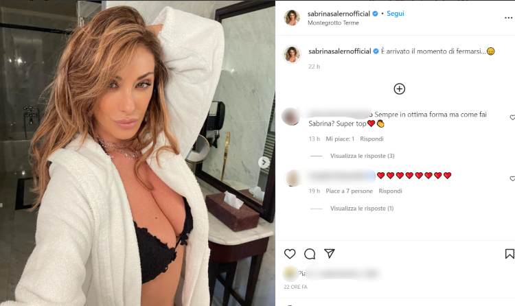 La foto pubblicata oggi è stata scattata in un hotel con tanto di centro termale dove Sabrina ha deciso di regalarsi un momento di relax: “Ogni tanto bisogna fermarsi” scrive lei. L’accappatoio aperto mostra un bikini nero da urlo e sono tantissimi i follower che commentano la foto facendole complimenti sinceri.