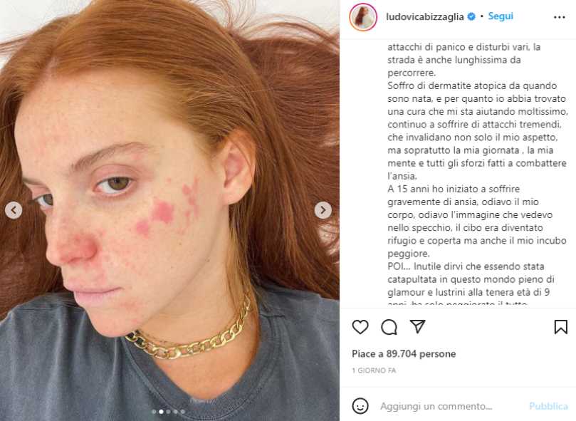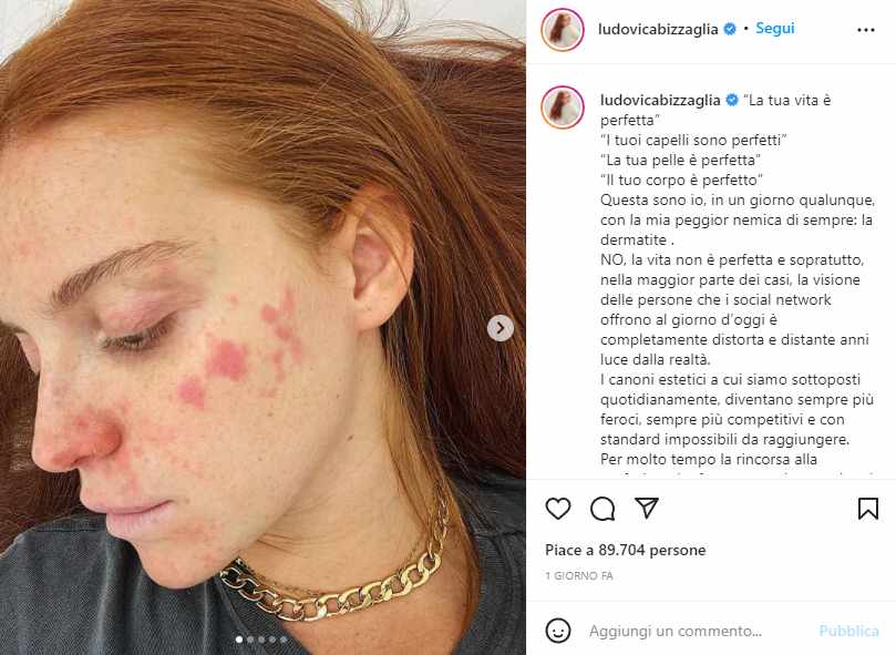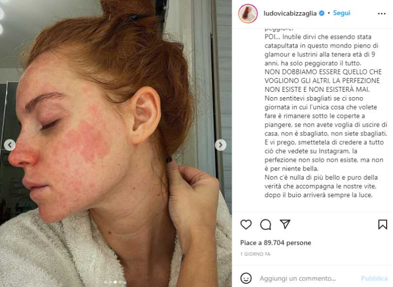 Nel post, Ludovica Bizzaglia sottolinea come il rincorrere determinati canoni l’abbia portata ad avere dei problemi. Come attacchi di panico e disturbi vari. Specialmente per una come lei che è entrata in questo mondo da piccolissima. Aveva 9 anni quando ha fatto la sua prima esibizione. Per questo motivo, l’attrice, tende a sottolineare che bisogna essere “reali”, come si è senza aspirare ad un’illusoria perfezione.