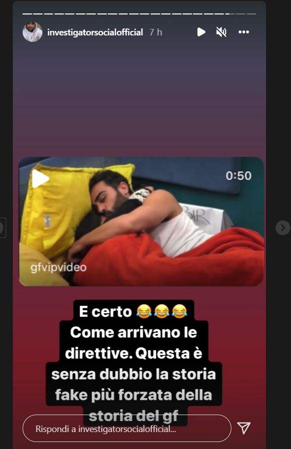 Il recente avvicinamento tra Gianmaria e Federica, infatti, ha fatto storcere il naso. Soprattutto all’investigatoresocialofficial, Alessandro Rosica. Tramite una storia Instagram ha repostato un breve video di loro due aggiungendo una frase molto dura. L’investigatore, vedendo i due in atteggiamenti intimi, ha prima parlato di direttive per poi definire tale storia fake e la più forzata della storia del programma.