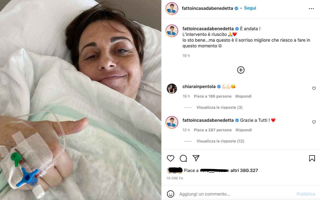 “È andata! L’intervento è riuscito. – ha scritto la cooking star – Io sto bene, ma questo è il sorriso migliore che riesco a fare in questo momento”, ha ammesso Benedetta pubblicando una foto di lei post operazione. In questo modo Benedetta ha tranquillizzato i suoi tantissimi fan.