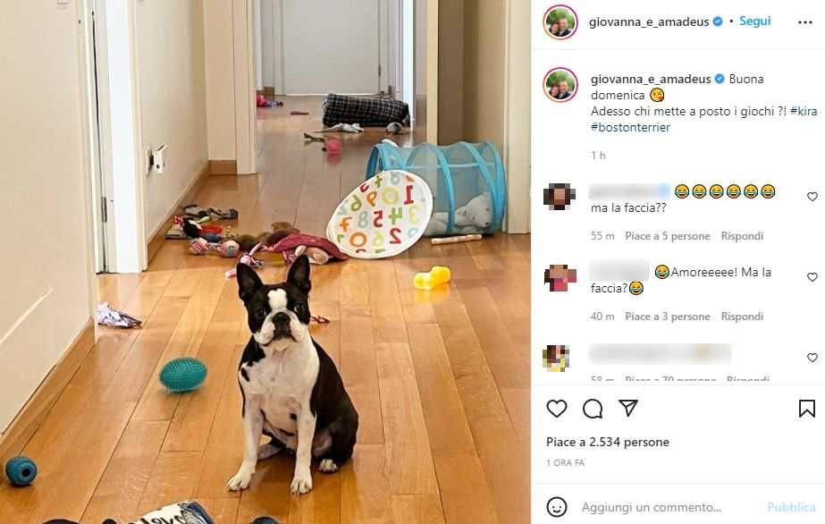 Il loro rapporto, dopo tempo, viaggia sempre più sereno e stabile. Sui social lo dimostrano. Giovanna Civitillo, questa mattina, ha voluto mostrare qualcosa di molto particolare. La loro casa completamente sottosopra. La foto non inquadra solo gli oggetti sparsi per casa ma anche il colpevole. In prima battuta si nota subito Kira, il cane boston terrier che Amadeus e Giovanna hanno in casa. La faccia dell’animale domestico è davvero tutto un programma.