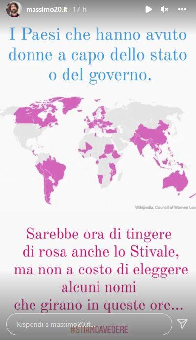 Sui suoi social continua il percorso tracciato in televisione. Ma qualche ora fa ha voluto dire la sua su un argomento politico molto sentito: le quote rosa. Ha prima postato un’immagine del mondo in cui molte zone sono colorare di rosa. Quelle colorate sono i Paesi che hanno avuto donne la vertice del proprio sistema. Tra questi non figura l’Italia. Ed ecco la sua decisa presa di posizione.