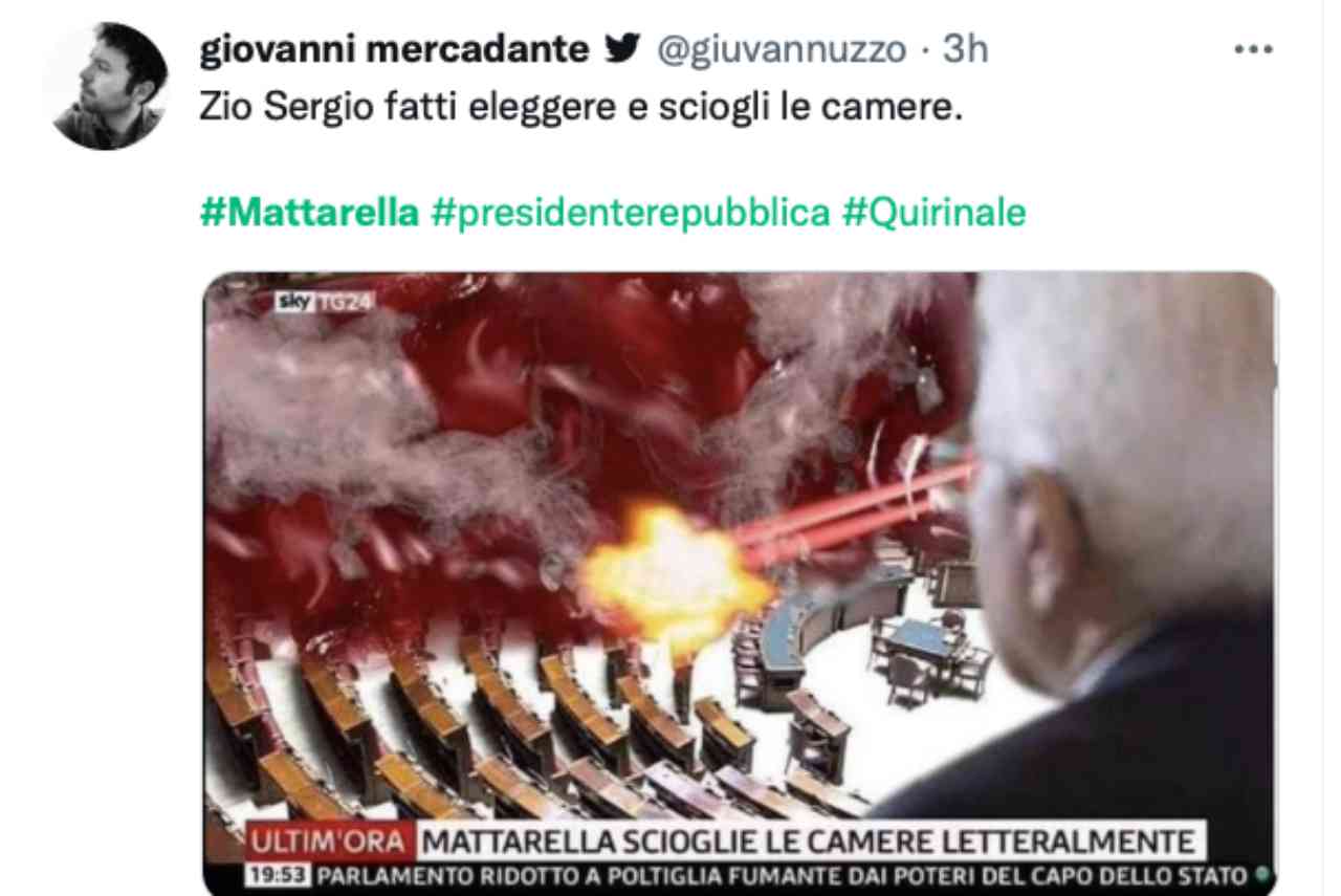 Questo scenario ha fatto scatenare il web che ha dato il meglio di se in questa situazione. Moltissimi utenti hanno fatto leva proprio su questo cambio che la politica chiede a Mattarella. Si va da un fotomontaggio di Mattarella in un film di Aldo Giovanni e Giacomo con la scena in cui Giovanni chiede aiuto con la parola scritta sul palmo della mano. Fino ad arrivare a Mattarella che scioglie, con raggi laser che partono dai suoi occhi, le Camere.