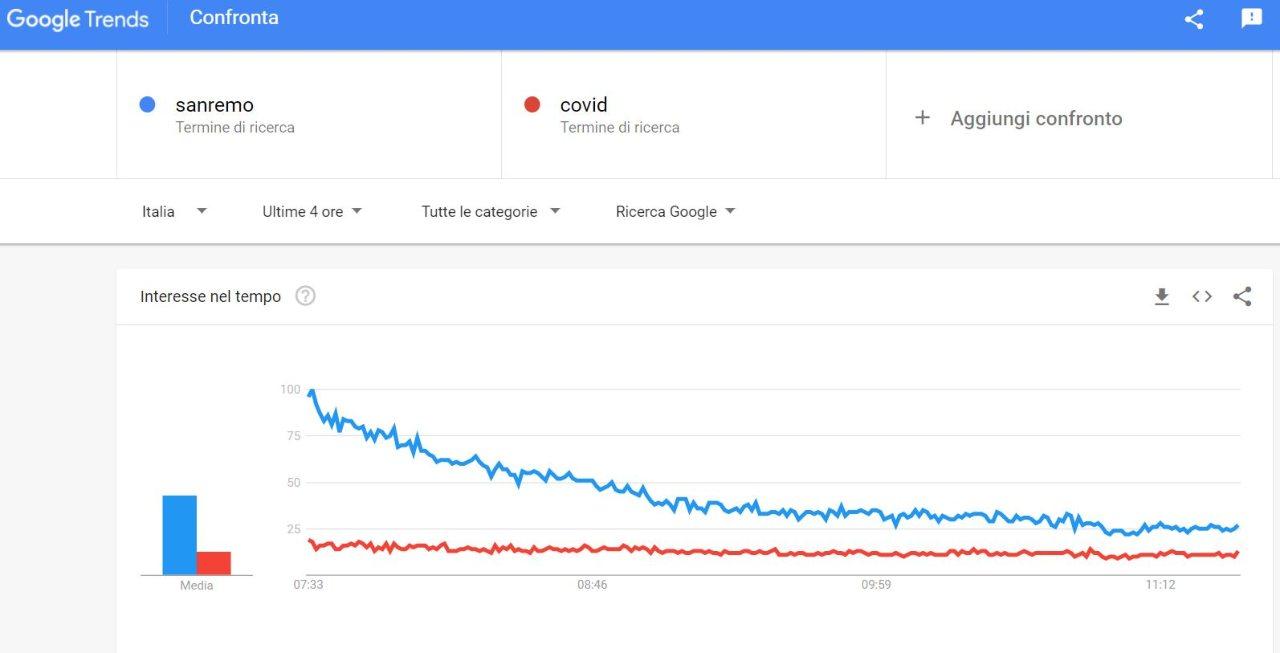 Potete vedere come le ricerche in merito alle tematiche riguardanti Sanremo (linea blu) siano superiori a quelle legate al Covid (linea rossa). Un risultato sicuramente da sottolineare e che evidenza l’attenzione mediatica sulla kermesse.