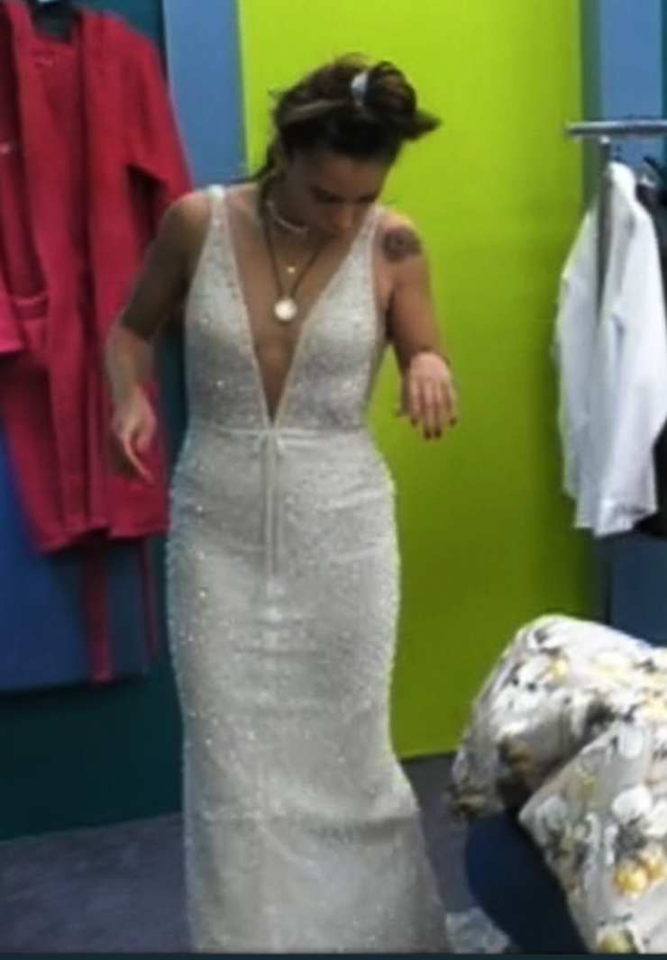 Per la finale del Gf entrambe le ragazze saranno in lungo per la prima volta. Jessica indosserà un abito color bianco avorio tempestato di swarovski. Il vestito è molto fasciante e stretto, con una profonda scollatura a v al centro ma nessuno spacco ai lati. Alcuni utenti, sul web, si preoccupano che i movimenti della principessa potrebbero essere limitati dall’abito stretto. Jessica, però sembra molto a suo agio con questo outift.