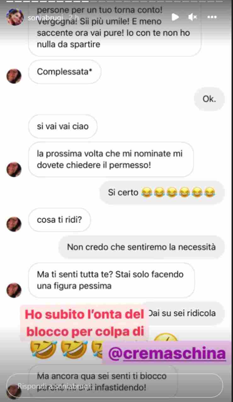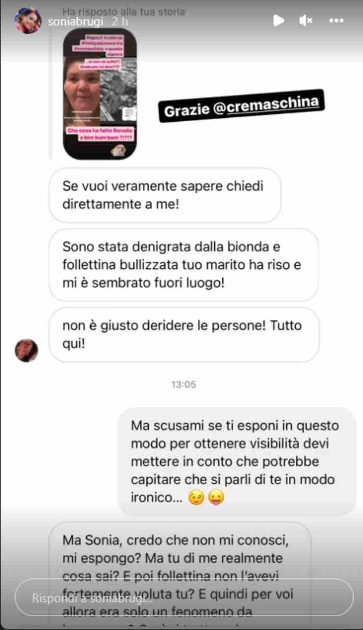 Chiara ha poi specificato di non gradire di essere nominata pubblicamente in televisione: “La prossima volta chiedetemi il permesso, grazie” scrive perentoria. La querelle non finisce qui poiché Sonia ha condiviso la conversazione attraverso le sue storie e l’influencer, venendolo a sapere, ha minacciato la Bruganelli di querela. Lei, dal canto suo, non sembra preoccuparsi minimamente di questa situazione e pare averla presa con una certa ironia.