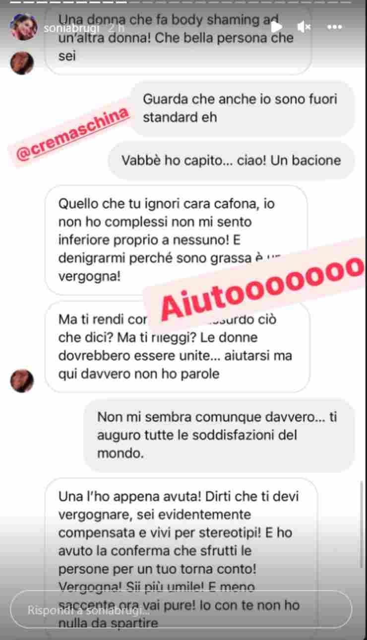 Sonia ha controbattuto che definire la Cremaschi “gallinetta” sia comunque un’offesa, ma Chiara non la manda a dire e continua la sua invettiva. La moglie di Bonolis ha poi definito Chiara “esteticamente diversa” dalle altre influencer sottolineando che sia proprio questo fatto ad averla resa famosa. La Dalessandro, quindi, si arrabbia e accusa la Bruganelli di fare “bullismo” nei suoi confronti: “Ma come ti permetti? Una donna che fa body shaming ad un’altra, ti devi vergognare!”.