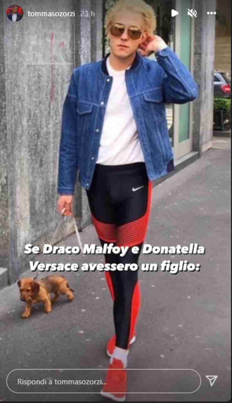 In uno di questi scatti Zorzi appare con una chioma giallo acceso che tirava all’indietro, occhiali da sole, leggins super aderente e giacchetto di jeans: “Se Donatella Versace e Draco Malfoy avessero un figlio” scrive lui scherzando. Non finisce qui perché sono molte le foto in cui Tommaso appare totalmente diverso da oggi: in una sembra che in testa abbia una vera e propria ananas. In un’altra immagine è di nuovo castano ma i capelli gli ricadono lisci a caschetto intorno al viso.