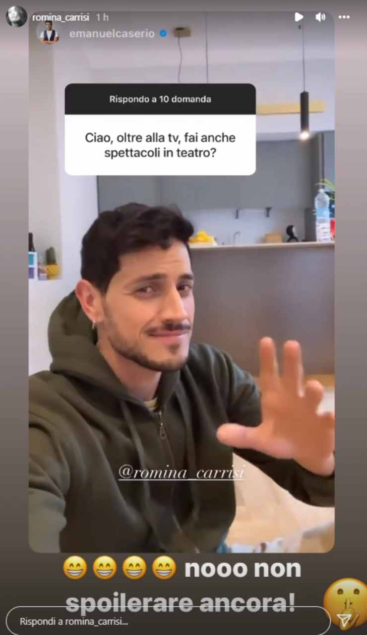 Oggi sul profilo di Emanuel è apparsa un’altra storia che fa pensare, poi riproposta da Romina. Rispondendo alla domanda di un fan l’attore ha ammesso che lui e la Carrisi hanno in cantiere un progetto in teatro che presto racconteranno a tutti: per ora è ancora top secret.