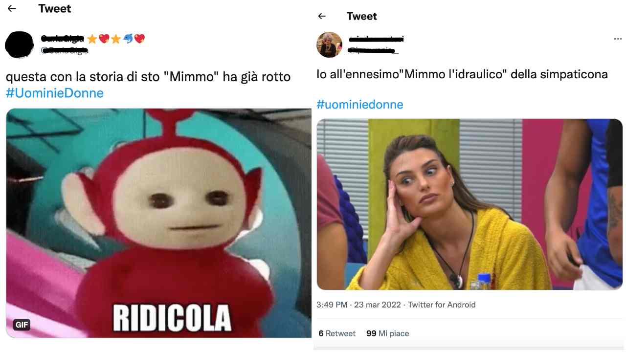 Sui social infatti in tendenza c’è spesso e volentieri proprio “Mimmo l’idraulico”, questo perché la tronista lo cita spesso come esempio. Cosa che non è stata presa bene da tutti, visto che alcuni hanno sottolineato che sia una finzione, mentre altri sono stufi. “Questa con la storia di sto “Mimmo” ha già rotto”, si legge su Twitter.