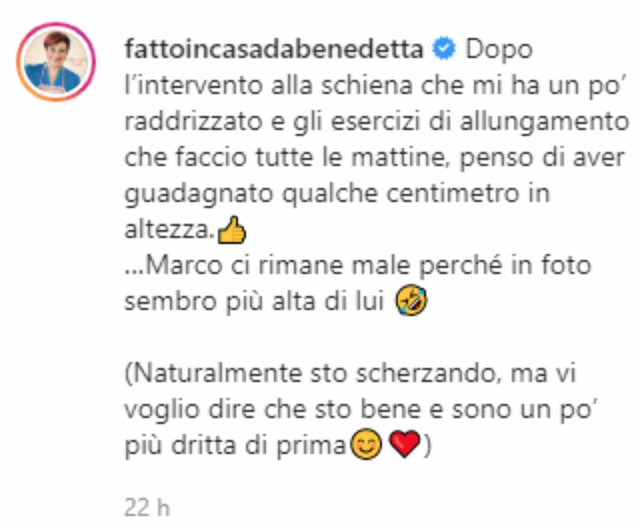L’ultimo periodo della cooking star, però, non è stato molto positivo. Benedetta Rossi, infatti, si è sottoposta ad un delicato intervento alla schiena. Come possiamo immaginare, il post intervento ha avuto bisogno di un percorso ben preciso per ristabilire l’equilibrio iniziale.