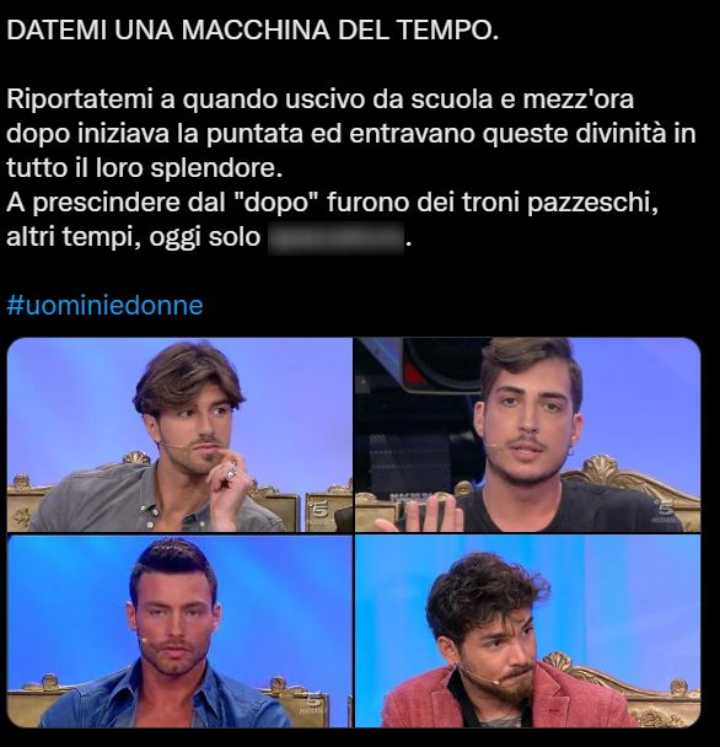Uomini e Donne è un programma che ha fatto la storia. Il legame creato con il pubblico è davvero qualcosa di importante. Come possiamo immaginare, i momenti di nostalgia possono arrivare in qualsiasi momento. In questo caso, un utente Twitter ha invocato la macchina del tempo. Infatti, si vorrebbe ritornare a quando usciva da scuola e dopo mezz’ora partiva il programma. A quell’epoca, i quattro tronisti erano Andrea Damante, Oscar Branzani, Eugenio Colombo e Andrea Cerioli.