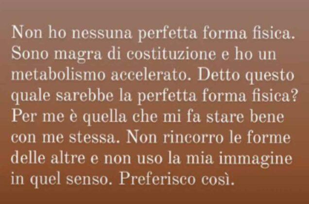 Sul proprio account Instagram, la giornalista si è concessa a qualche domanda dei suoi follower. Un curioso ha chiesto lumi sulla sua perfetta forma fisica, se ci sia un segreto. La Fialdini, incalzata, ha risposto in maniera decisa e onesta. Ha ammesso, infatti, di non avere nessuna perfetta forma fisica. Spiegando che è magra di costituzione e ha un metabolismo accelerato. Ma la risposta non termina qui, perché la giornalista ha voluto chiarire un aspetto.