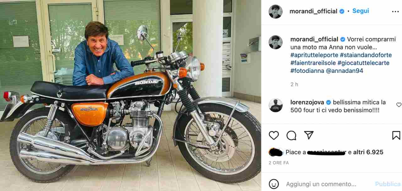 “Vorrei comprarmi una moto, ma Anna non vuole…”, questa è la confessione di Morandi scritta sui social. Una didascalia in accompagnamento alla foto, scattata dalla moglie Anna con cui ha un legame bellissimo, e che lo vede appoggiato ad una bellissima moto retrò che ha conquistato i suoi fan. Un modello che però Gianni non potrà comprare proprio per “colpa” di Anna. La moglie, infatti, ha detto un “no” deciso al cantante bolognese.