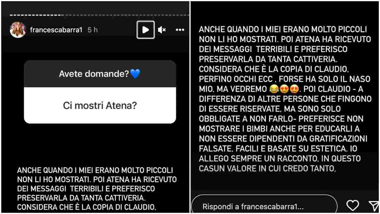 I fan della coppia sanno molto bene che Francesca e Claudio sono molto attivi sui social, dove condividono spesso momenti della loro vita privata, rendendo partecipi i loro follower. Molti di loro, infatti, vogliono vedere il volto della piccola Atena nata a febbraio. A rispondere alla richiesta fatta da un utente su Instagram ci ha pensato la giornalista tramite le sue storie.