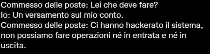 Molte persone si sono riversate su Twitter per diffondere la situazione attuale. Sotto l’hashtag #PosteItaliane, ci sono diverse testimoniante. Un utente ha parlato chiaramente di un attacco hacker in corso. Tale attacco non permette il corretto funzionamento neanche negli uffici postali. Ma le testimonianze non finiscono qui.