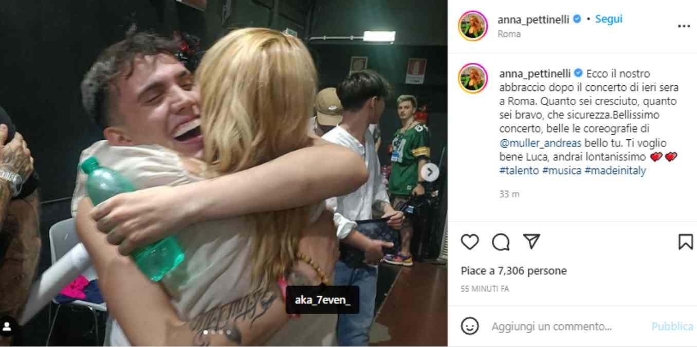 “Ecco il nostro abbraccio dopo il concerto di ieri sera a Roma. Quanto sei cresciuto, quanto sei bravo, che sicurezza. Bellissimo concerto, belle le coreografie di @muller_andreas bello tu. Ti voglio bene Luca, andrai lontanissimo“ sono queste le parole della bionda che come tutti ricorderanno è stata la prima a credere nel cantante scegliendolo nel suo percorso al serale e mettendolo nella sua squadra, nonostante qualche tirata di orecchie che nessuno potrà dimenticare.