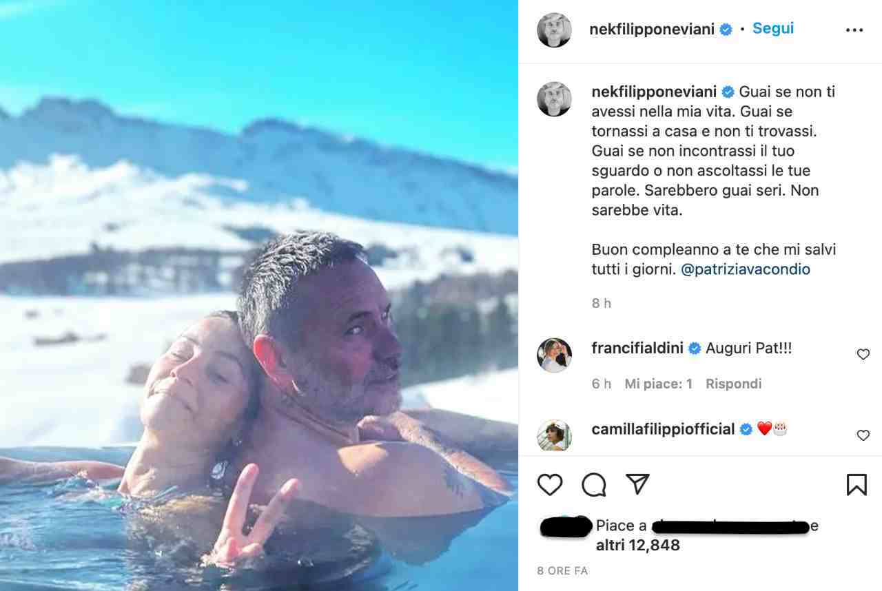 Nel giorno del compleanno della sua dolce metà, Nek ha voluto renderle omaggio con un bellissimo post che ha emozionato tutti coloro che gli sono affezionati. Il cantante ha pubblicato una foto in cui è insieme alla moglie Patrizia Vacondio mentre sono a fare il bagno in una piscina all’aperto bollente mentre alle loro spalle si vedono le montagne innevate.