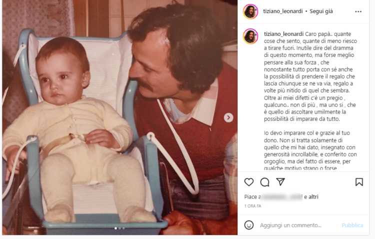 Tiziano ha dedicato all’amato padre un lunghissimo post sui social, correlato anche di alcune foto: una più recente e l’altra di quando era piccolo. Qui il musicista dei Cugini di Campagna ha dimostrato tutto l’amore e la stima che provava per suo papà: Mi hai lasciato un dono, il mio unico pregio, quello di ascoltare umilmente – scrive l’uomo – devo tentare di crescere ulteriormente e non perdere le opportunità della vita e, lo so, mi aiuterai tu” queste le bellissime parole di Leonardi.