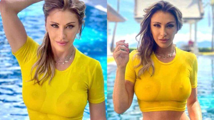 La Salerno non è nuova a certi tipi di scatti. Di recente, Sabrina Salerno si è mostrata con un décolleté che ha elettrizzato tutti. Questa volta, invece, la showgirl si è mostrata con una maglietta di colore giallo ma bagnata dato che lei era all’interno di una piscina. Il materiale della maglia al contatto con l’acqua ha mostrato il suo décolleté. Di fatto, mandando in estasi tutti i suoi affezionati.