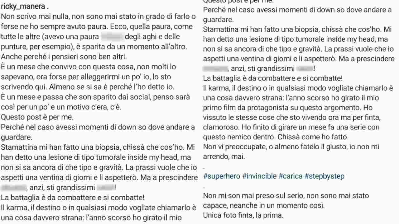 Nonostante il momento delicato. Riccardo Maria Manera ha trovato le parole per comunicare la sua attuale situazione. Il suo post si apre con l’attore che mostra la sua paura per poi spiegare il motivo della sua assenza. Un’assenza durata più di un mese. Manera svela di aver subito una biopsia. Gli hanno detto della lesione di tipo tumorale ma non si conosce la gravità e il tipo. Dovrà attendere almeno venti giorni.