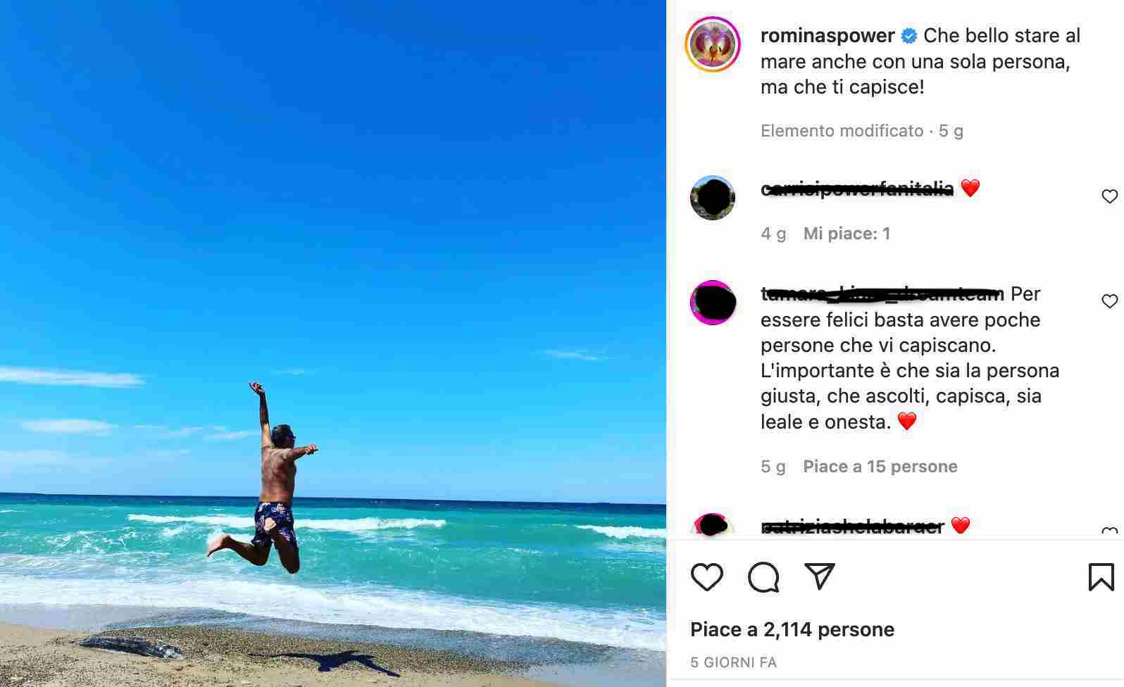 “Che bello stare al mare anche con una sola persona, ma che ti capisce!”, ha scritto Romina. Delle bellissime parole rivolte ad un uomo speciale per lei, ovvero al figlio Yari Carrisi, il secondogenito nato dal matrimonio tra lei ed Albano. Nello scatto possiamo vedere proprio Yari fare un salto in riva al mare prima di tuffarsi.