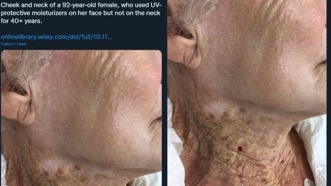 Nella didascalia a supporto del tweet, il dermatologo sottolinea come la donna abbia usato la crema solo sul suo viso. E, in oltre 40 anni, mai sul suo collo. La differenza, come vedrete, è lampante tra collo e guancia. Gli studiosi dell’Università tecnica di Monaco hanno svelato come ci sia una netta differenza del danno che provoca il sole. A maggior ragione tra parti del corpo protette dalla crema solare con quelle senza protezione.