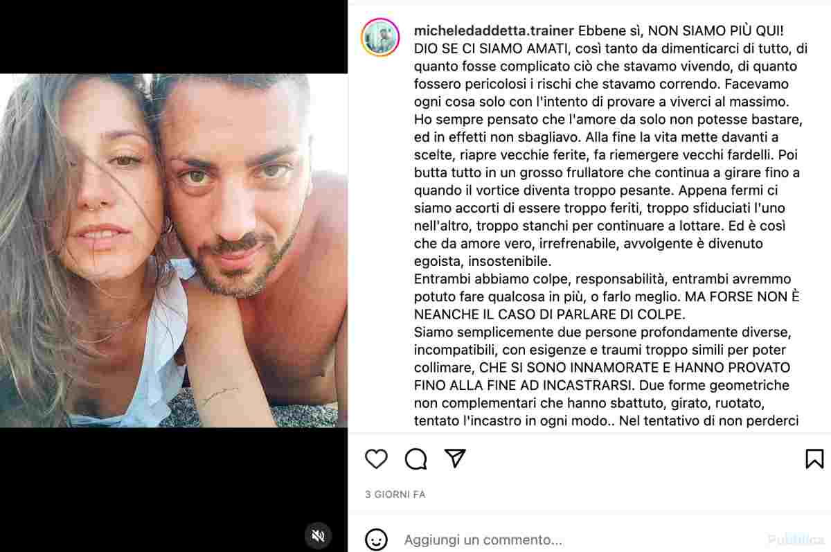 Michele, ha poi sottolineato che, ad un certo punto della loro storia d’amore, si sono accorti di essere sfiduciati e troppo stanchi per continuare a lottare per portare aventi quell’amore troppo ferito. “Ed è così che da amore vero, irrefrenabile, avvolgente è divenuto egoista, insostenibile. – si legge – Entrambi abbiamo colpe, responsabilità, entrambi avremmo potuto fare qualcosa in più, o farlo meglio”.